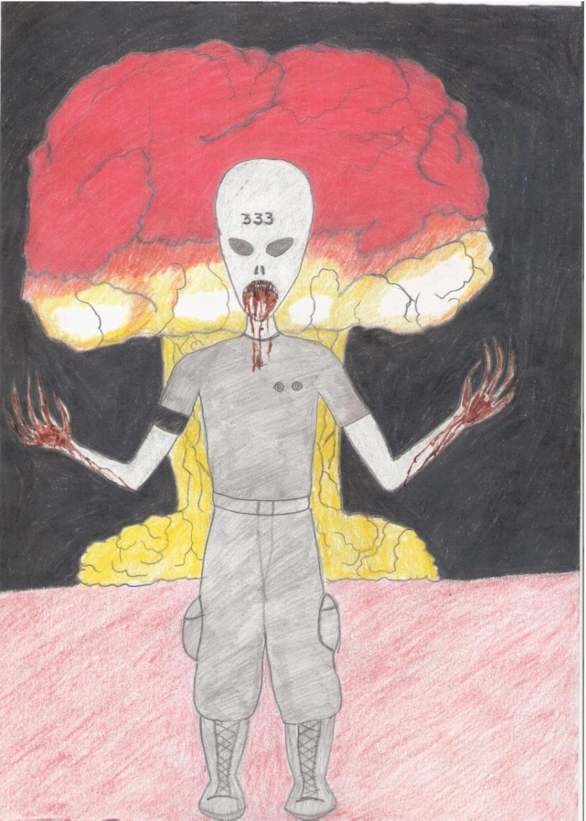 He is a grim, grey alien with large, almond-shaped eyes and a small, skeletal figure (which is in contrast to his over-sized head.) He wears a Drill Sgt. Uniform (including a large, harsh brimmed hat with the numeric 333 emblazoned on the front, military pants tucked into boots and a military battle-ready logistical jacket emblazoned with the numeric '333 and on which is pinned an insignia of the nine Angles, a patch bearing the sigil of the TOB and upon the collar-tab epaulets is the number '333' - the latter which appears on both of his thin, starved shoulders.) He wears a black armband with the large white letters sewn onto the clothes bearing the initials "VVM". His mouth is only a slit which never smiles. From his mouth emanates only HATE because he hates you he wants to DISCIPLINE you, he wants to PUNISH you he wants to push you over the brink so that you fall - like chaff - into the blaze of the ABYSS, the blaze of TORTURE, the blaze of DISCIPLINE.