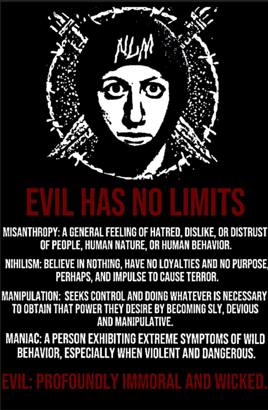 The mascot for NLM is less of a character of fiction, as we will see with Drill Sgt. Grey. But the traits of a serial killer, of a mass murderer, a rapist, a school shooter, a terrorist, a maniac that is what they seek in a character trait for a recruit. Within the night stalker is found the types of crimes a recruit must commit to join NLM sadistic sexual violence and murder. Serial killers, serial rapists, school shooters, cannibals, the "Saints" (famous mass shooters), become the heroes of the children in violent extremists milieus, the same way I grew up idolizing my favorite hockey player and author. The trait and personalities of the violent extremists that are mimetically transformed into characters and propaganda, become the traits those in the milieus will take on and emulate, as that is what has become normative to the in-group.