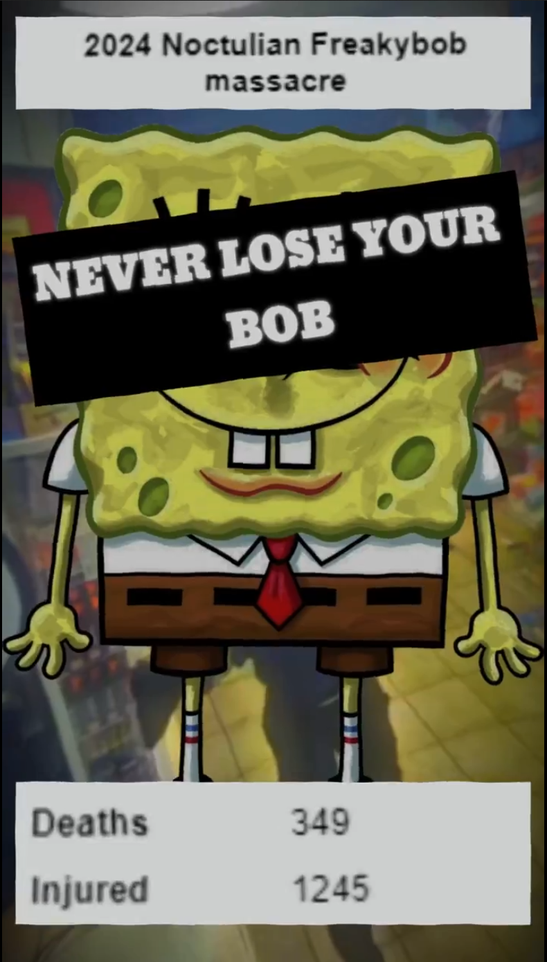 Noctulian FreakyBob—frequently abbreviated “FreakyBob” or rendered as the more explicit “FreakRapeBob”—constitutes nihilistic violent extremist network’s most plastic and adaptive original character, a memetic chimera in which children’s animation, racial animus, and occult accelerationism are compressed into a single, infinitely replicable asset. The genealogy of this character begins with 2010‑era surveillance stills of a convenience‑store robber wearing a SpongeBob SquarePants mask. The footage was cut up into images and turned into "edits" (images and videos) featuring O9A iconography, video footage from mass shootings then circulated as “classified evidence” of a nonexistent mass shooting against African Americans.