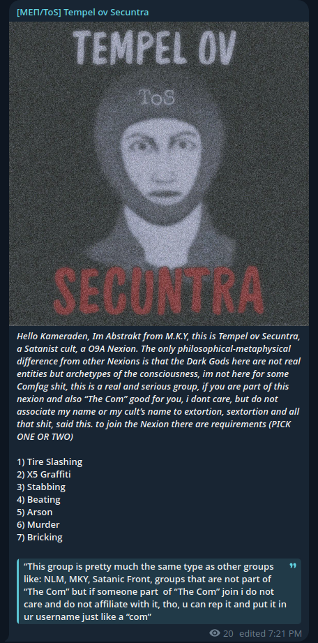 An emerging tactic, technique, and procedure (TTP) within the Com Network and adjacent “Edgesphere” milieus is the deliberate co-opting of the branding, aesthetic repertoires, and multimedia archives associated with historically established terrorist and violent extremist (TVE) entities (including but not limited to Atomwaffen Division, The Base, Order of Nine Angles, ISIS and al-Qaeda). While selected visual indicators and nomenclature may superficially map onto conventional warning signals used to identify terrorist and violent extremist entities, the actors driving Com Network activity differ materially from their “traditional” analogues in motivational structure, organizational logic, recruitment practice, and communicative intent. In many cases the primary functional role of legacy TVE branding in the Com is less about doctrinal transmission and more about status acceleration within an attention economy, where notoriety and transgression operate as currencies of subcultural capital.