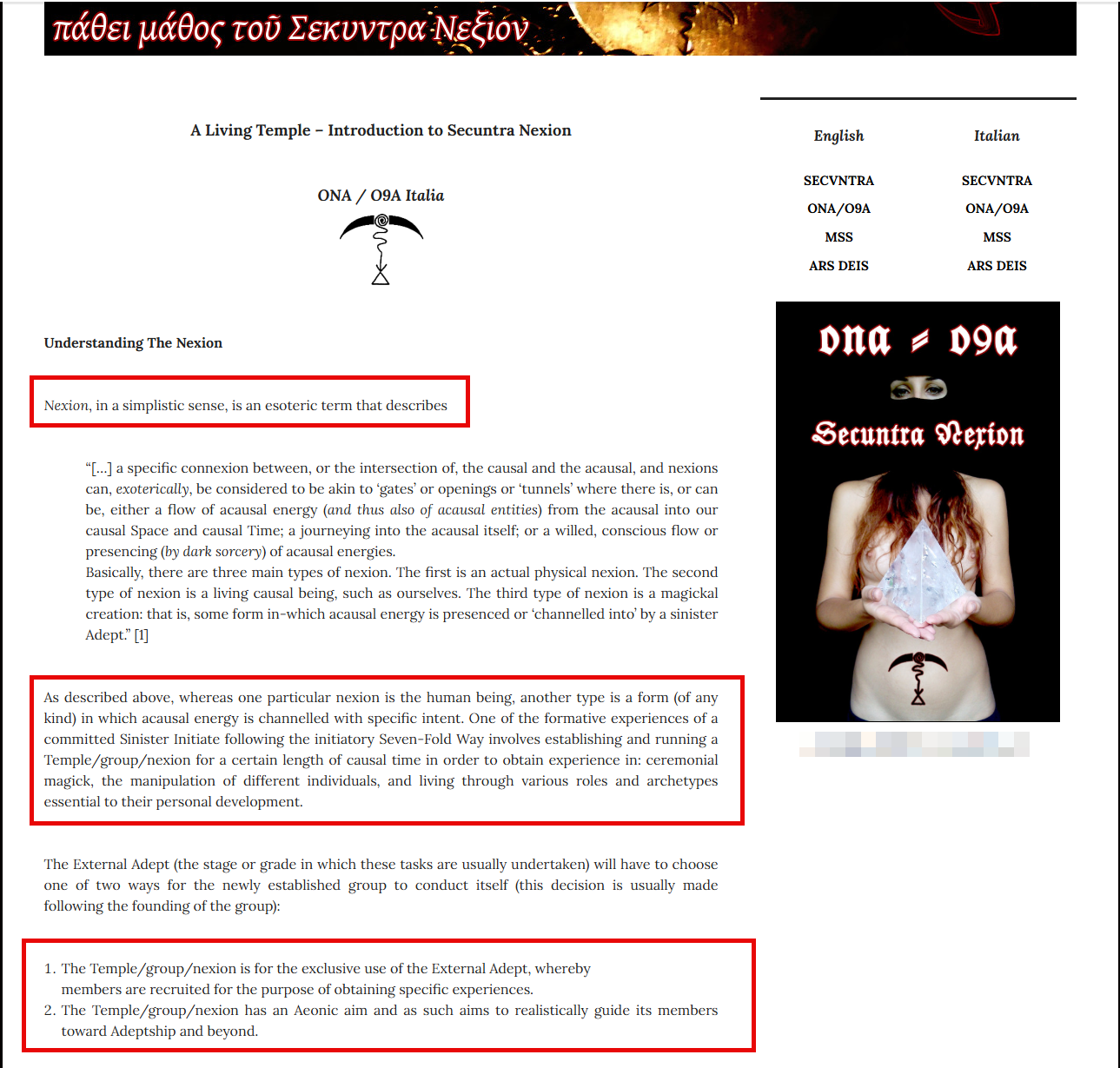 1) On the left you can see a now deleted Com-Affiliated group branding itself as Secuntra Nexion (Italian O9A nexion), as well as distance itself by claiming it is not part of the Com Network, but will welcome members of the Com Network. You can see that similar to The Base group requirements to join follow normative Com behaviors. 2) On the right you can see a screen capture of the Secuntra Nexion website where it references key esoteric dimensions of their practices and structures, as well as reference to a key element of O9A practices 'The Seven Fold Way.' Doctrinal elements are what drive the true Italian nexion.