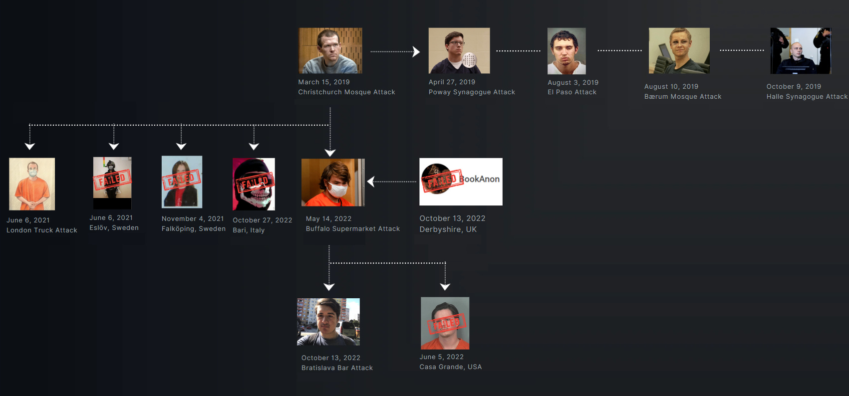 BookAnon and the Buffalo attacker were not part of the same group, and based on public information they did not communicate with each other. The Buffalo attacker did not know the Christchurch shooter, though he was inspired by him via the video of his terrorist act and his manifesto. The Bratislava shooter did not know the Buffalo shooter, though in his manifesto he said his attack is what inspired him to mobilize to violence. These individuals are not connected via personal interactions or by being part of the same group. They are connected by a shared propaganda network and the IMVE ecosystems they inhabit. However, these incidents do not occur ex nihilo, though these individuals may plan and carry out these attacks alone, they ecosystems they inhabit are one of the drivers. It is important to realize that this is a multifaceted challenge, at which we will never be 100% successful in preventing attacks.