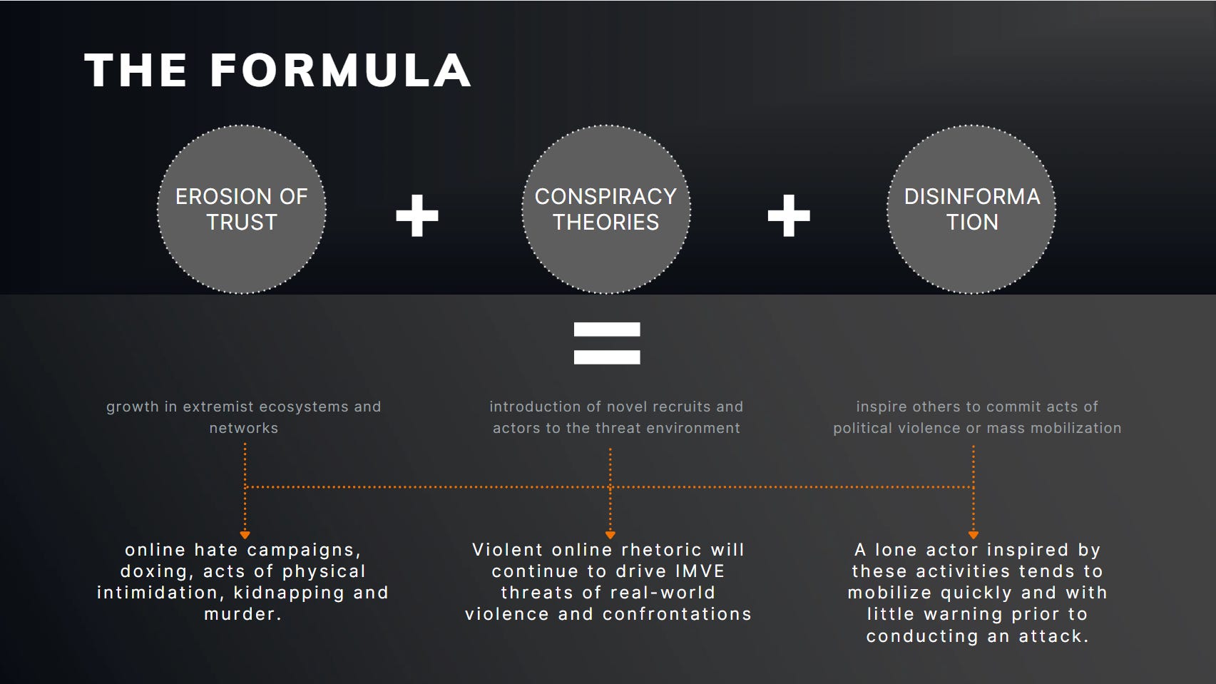 The combination of these elements has lead to increased growth in violent extremist ecosystems and networks, the recruitment of followers (both traditional and novel) and the inspiration of others to commit acts of anti-authority violence or mass mobilization. Anti-authority IMVE activities have included online hate campaigns, doxxing, acts of physical intimidation kidnapping, murder.